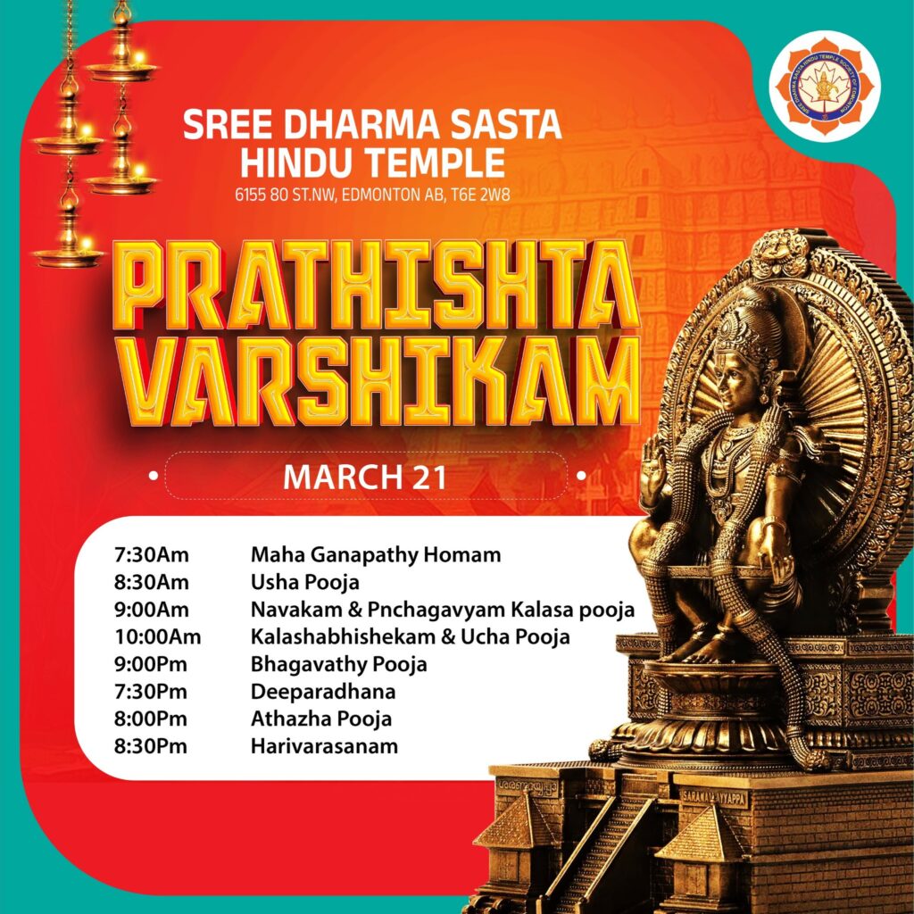 Sree Dharma Sasta Hindu Temple of Edmonton is celebrating its 8th Prathishta Dinam (Consecration Day) on March 21st 2026, with Special Poojas and Abhishekams. All are invited to join the celebrations in the morning and evening.
